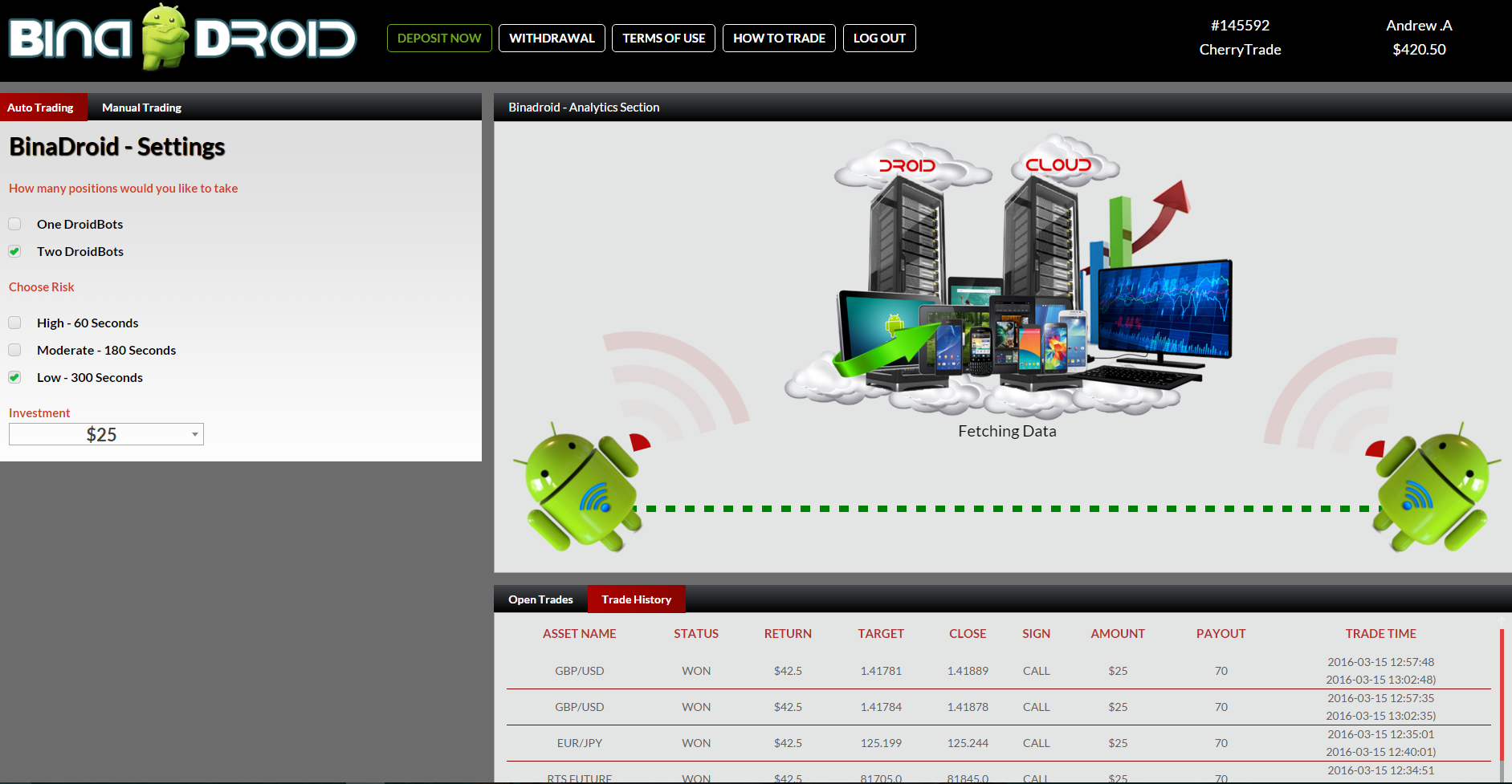 BinaDroid aka Binary Droid has been programmed with main focus on short term trades. This app does in-depth analysis of existing and current market conditions. This information has been gathered and applied into mathematical algorithm which enables the autotrader to execute trades with average accuracy of 80% up to 90%. On the other hand, this system also takes into account all of its previous trades which helps this app to improve its algorithm for future trades.